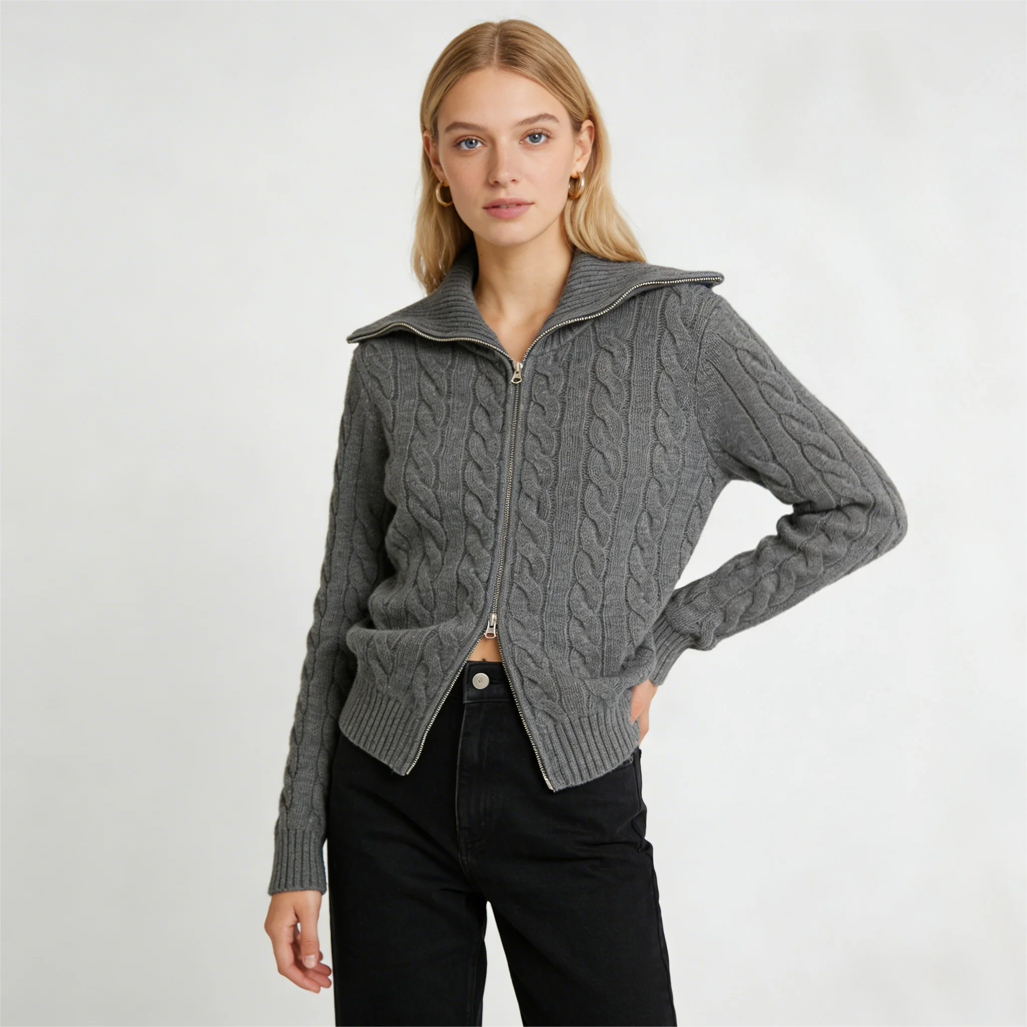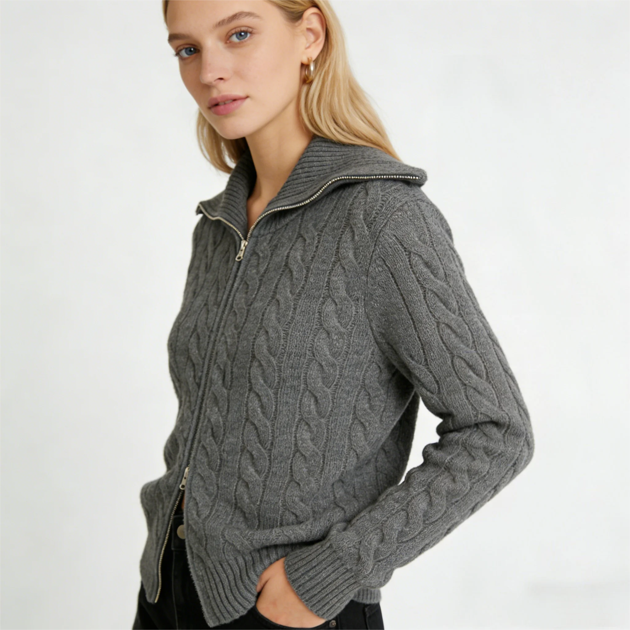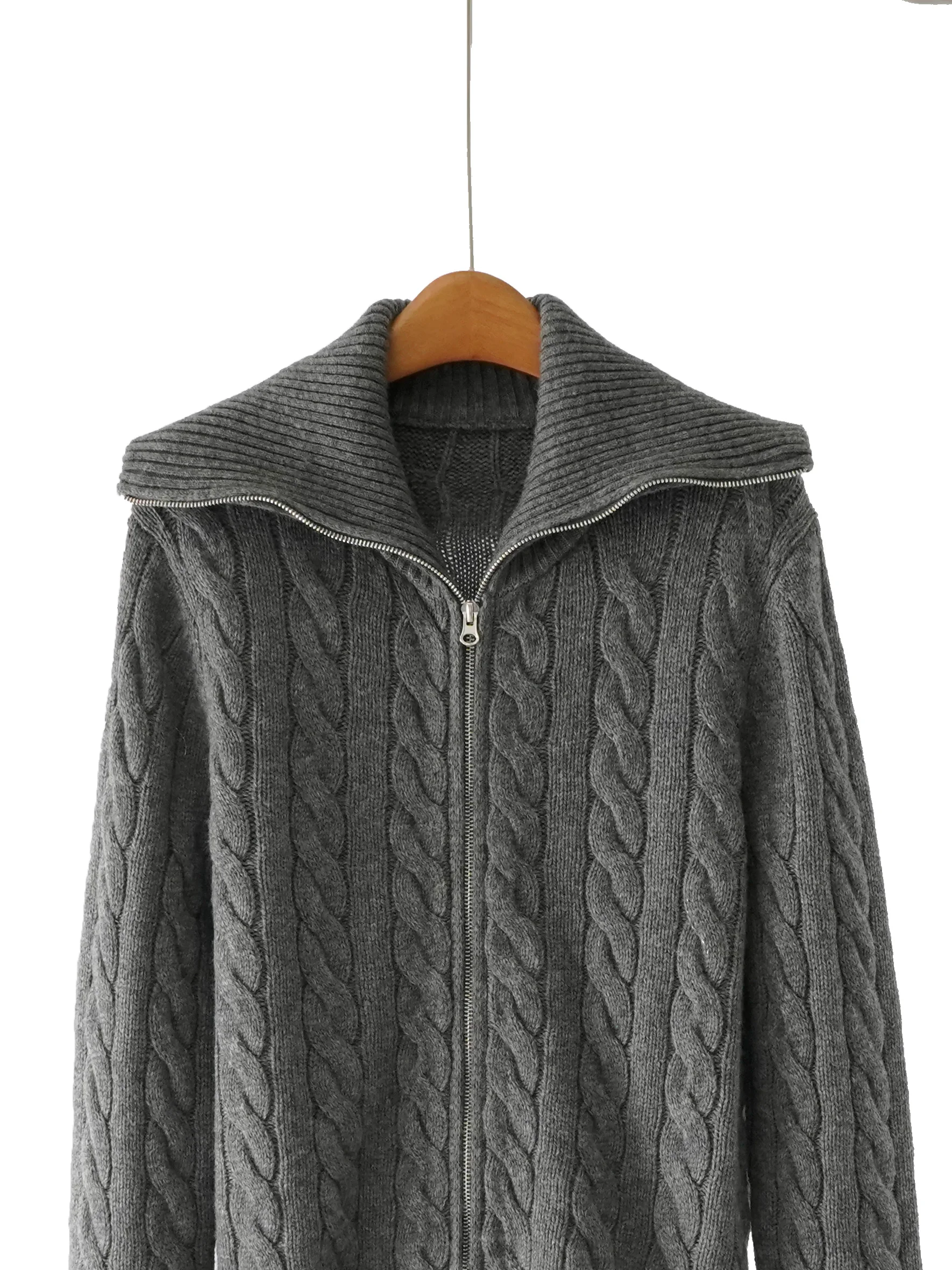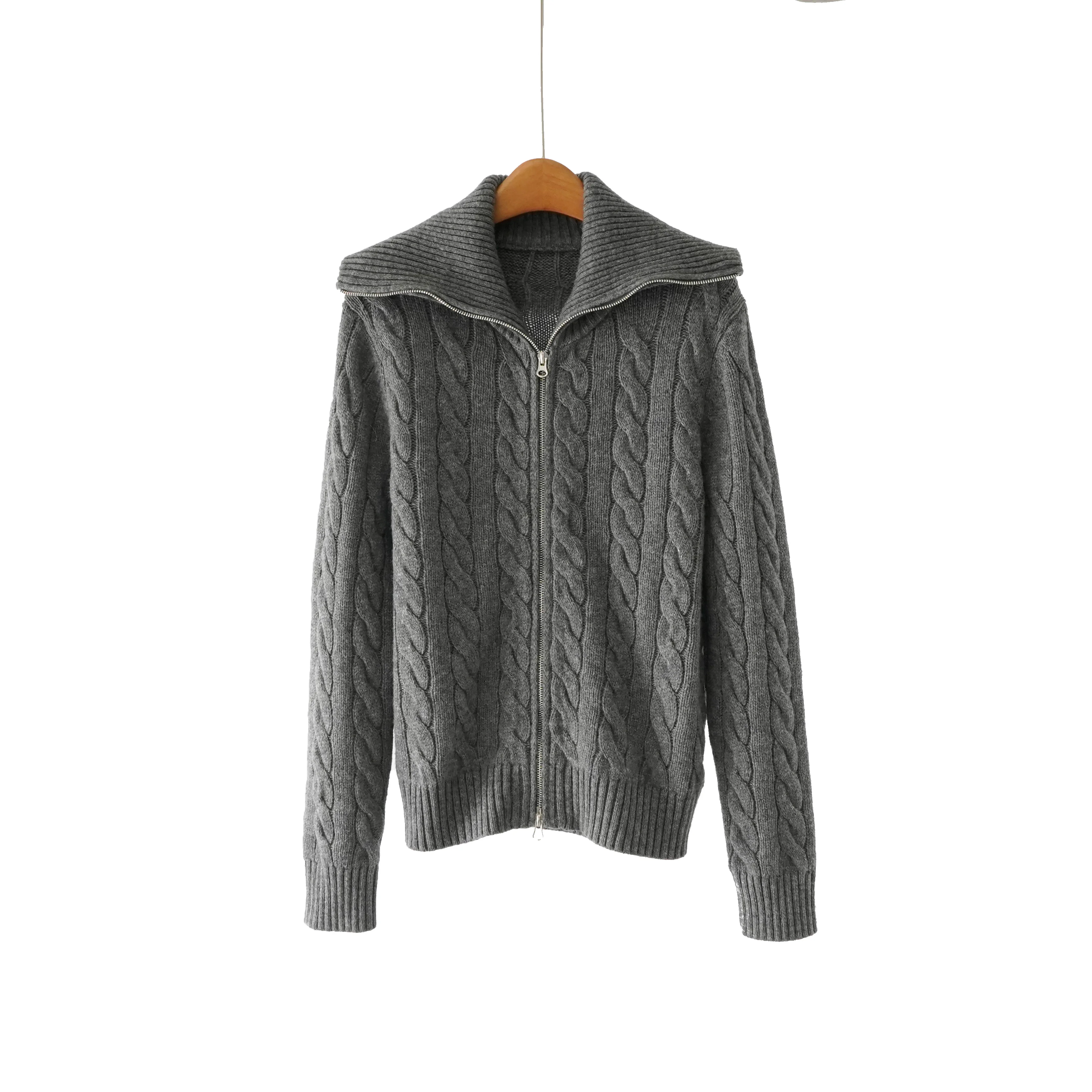 Best Selling Autumn and Winter Ladies Knitted Sweater Lapel Zipper Knitted Cardigan and Sheep Wool Fabric